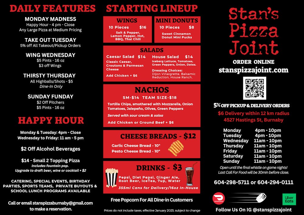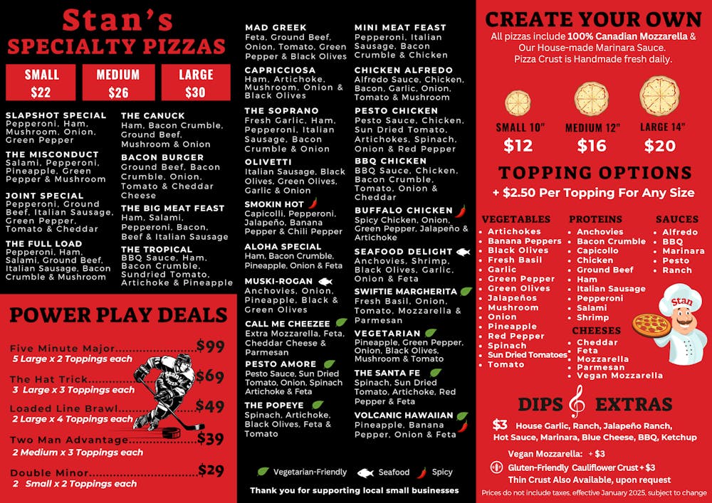 At Stan's Pizza Joint, we blend our passion for delicious food with the excitement of hockey and the joy of music, creating a vibrant and welcoming atmosphere for everyone.
